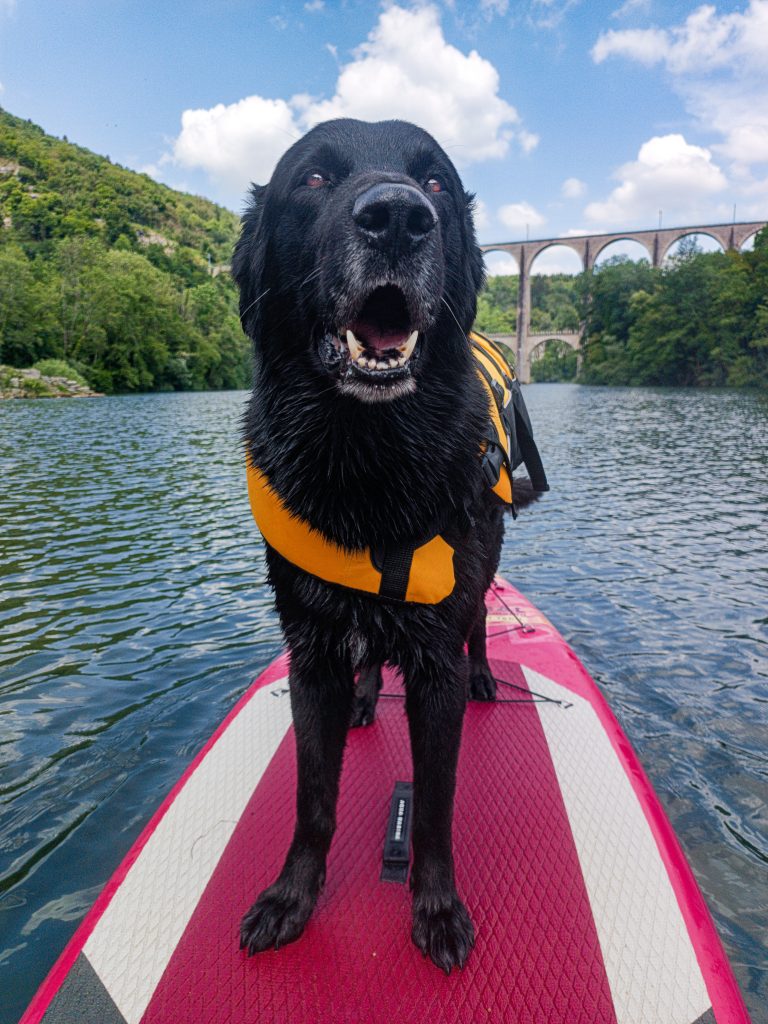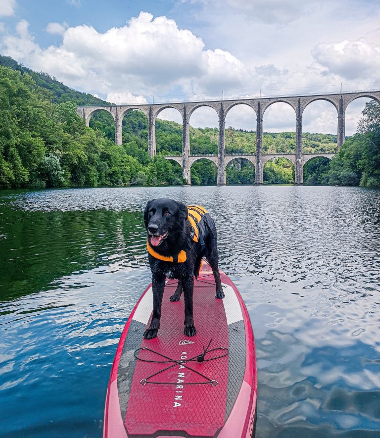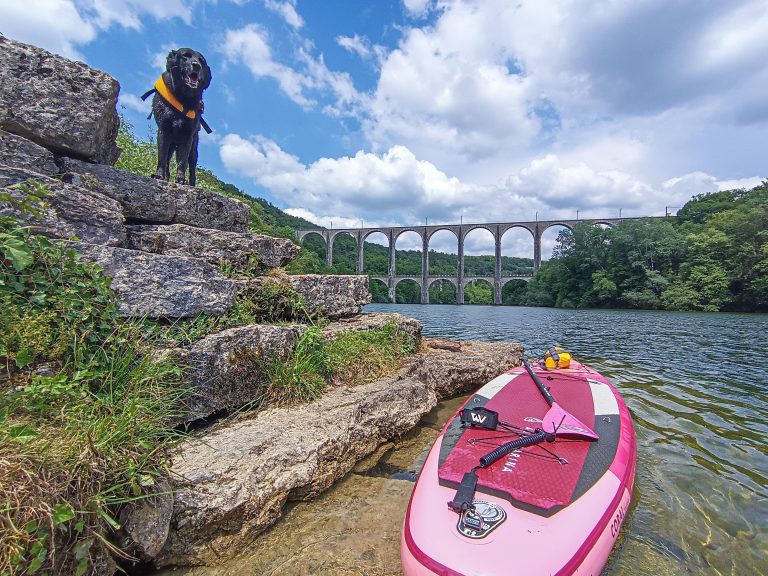 Idée de sortie paddle / canoë avec son chien sur la rivière d’Ain à la découverte du viaduc de Cize-Bolozon (Ain).