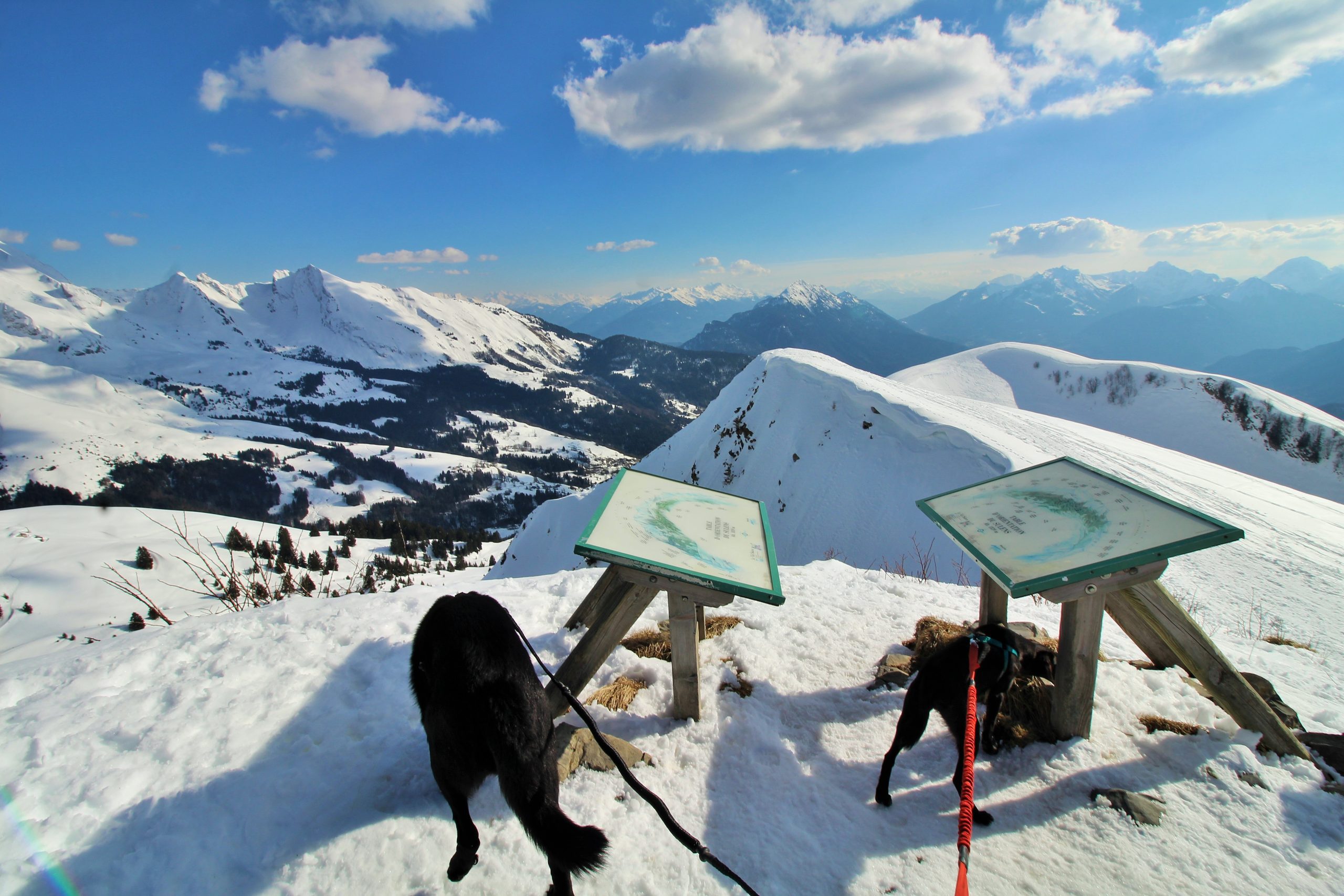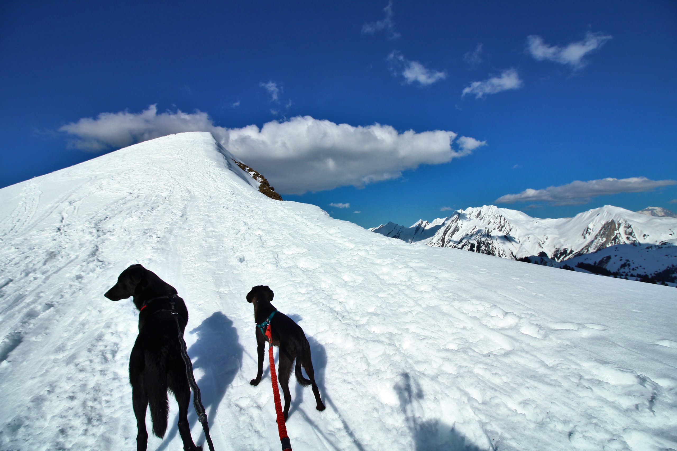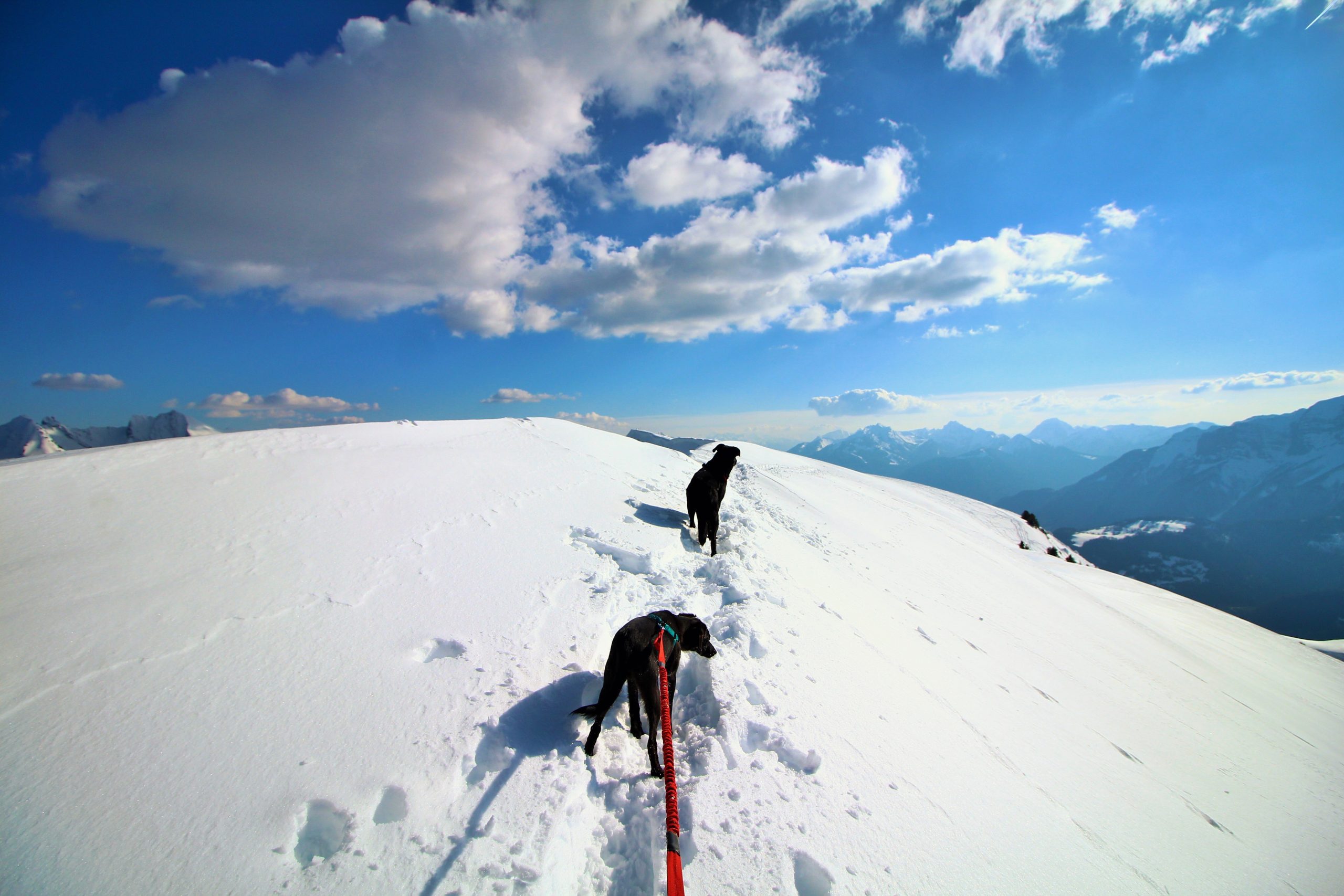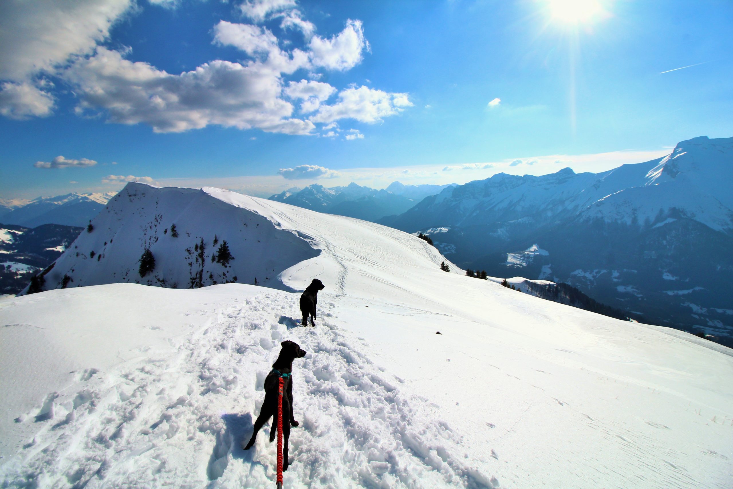On suit la ligne de crête pour atteindre le sommet de Sulens, j’attache les toutous car Iron est un peu fou de ski et Lucky est « imprévisible » d’autant plus que plus loin il y a des toutous.