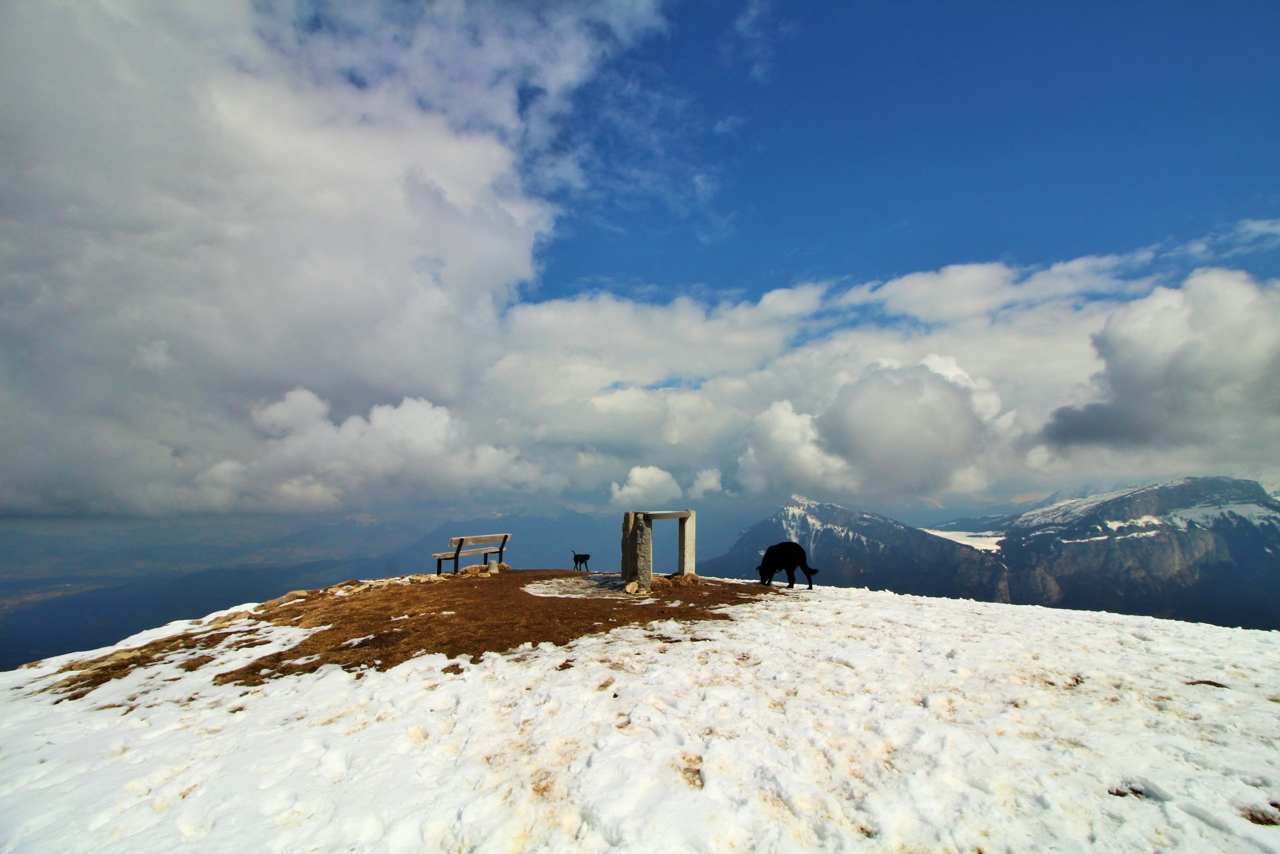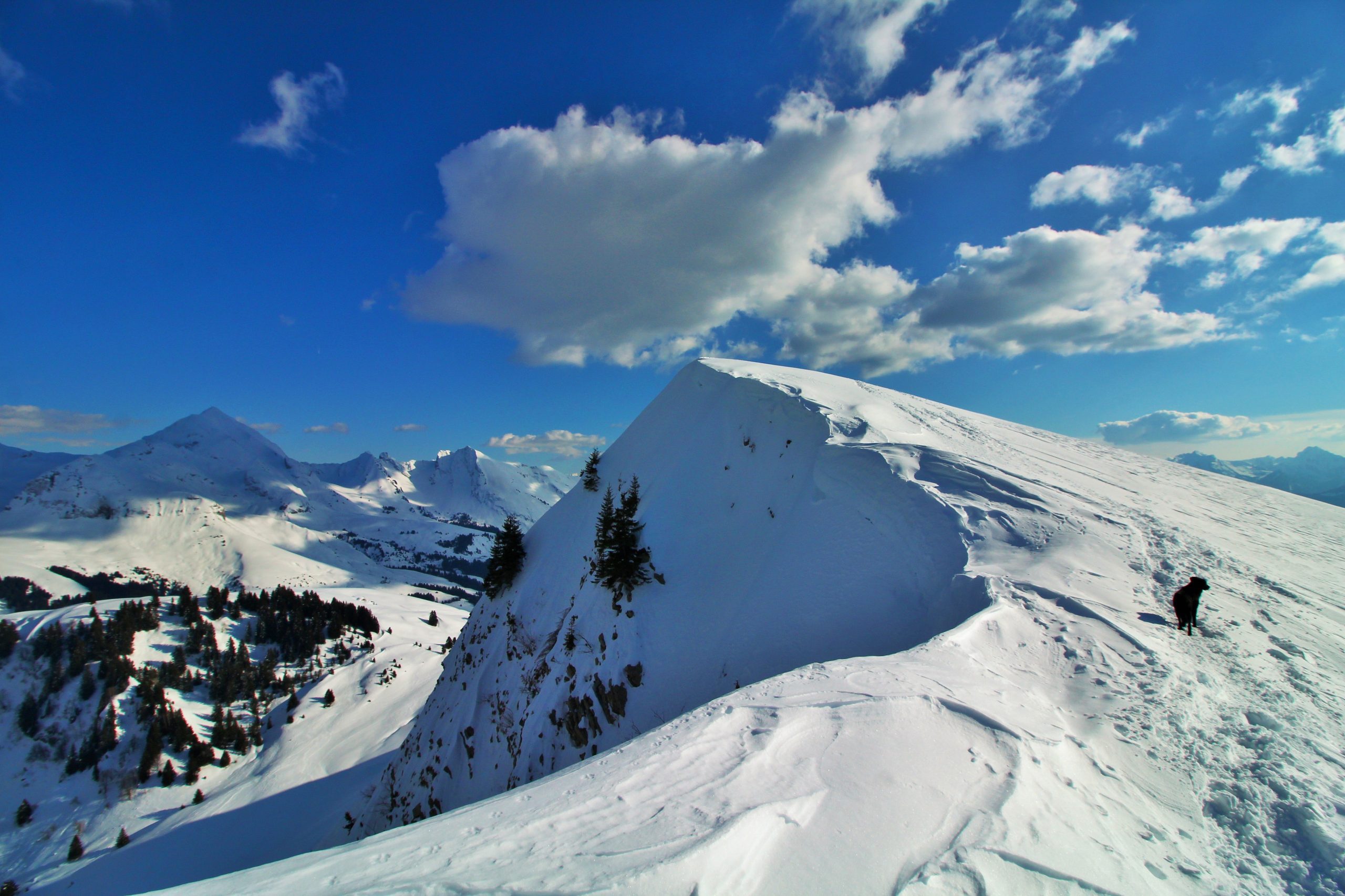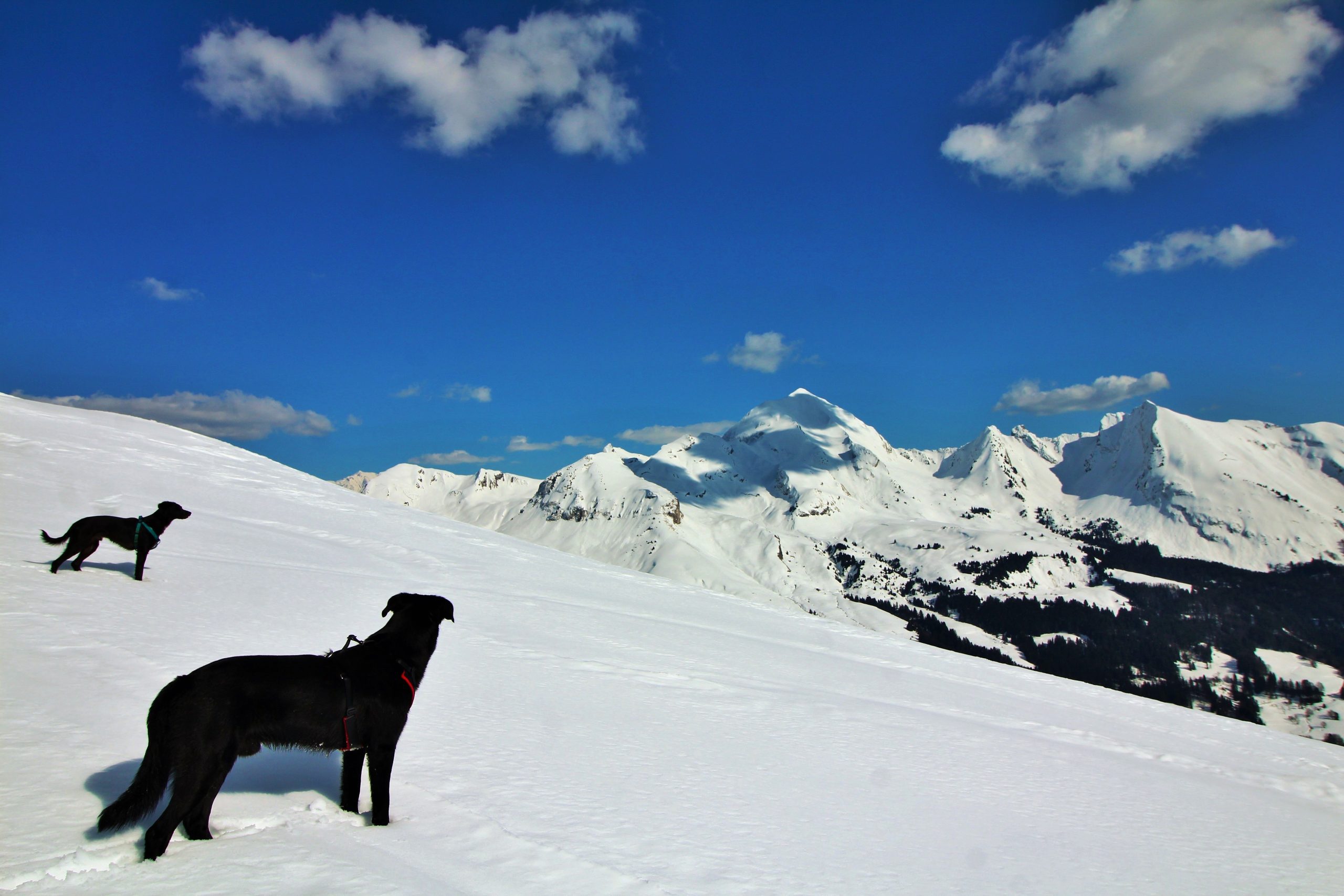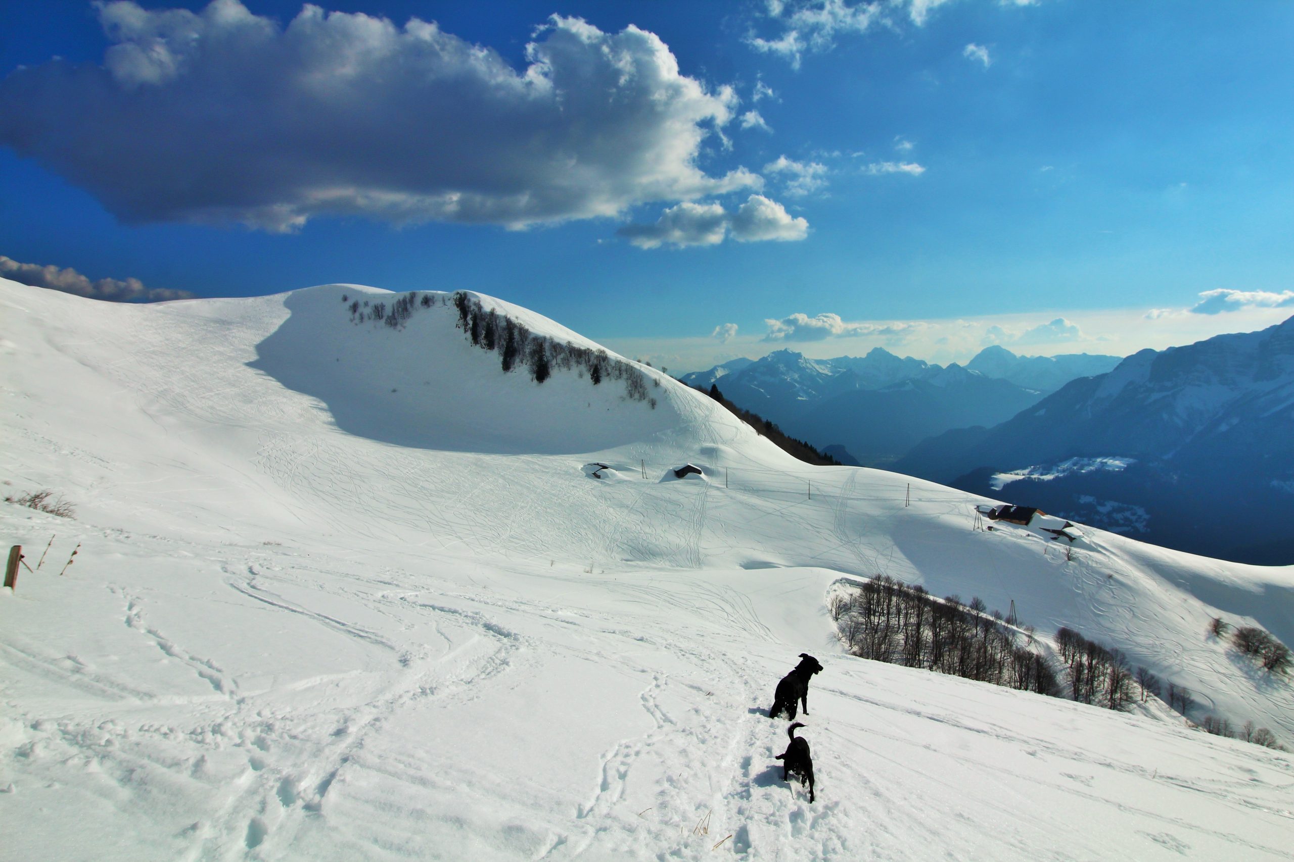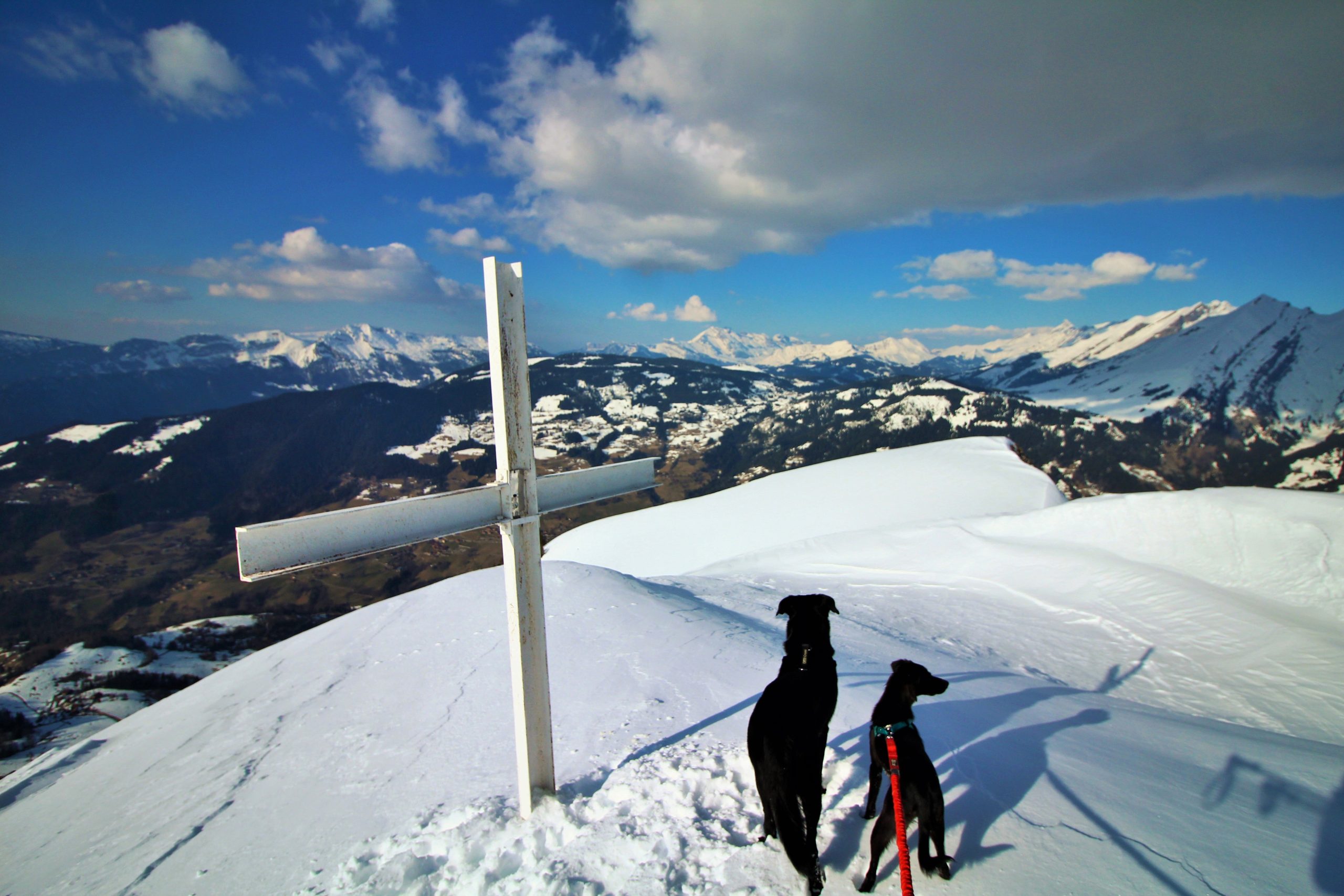 On suit la ligne de crête pour atteindre le sommet de Sulens, j’attache les toutous car Iron est un peu fou de ski et Lucky est « imprévisible » d’autant plus que plus loin il y a des toutous.