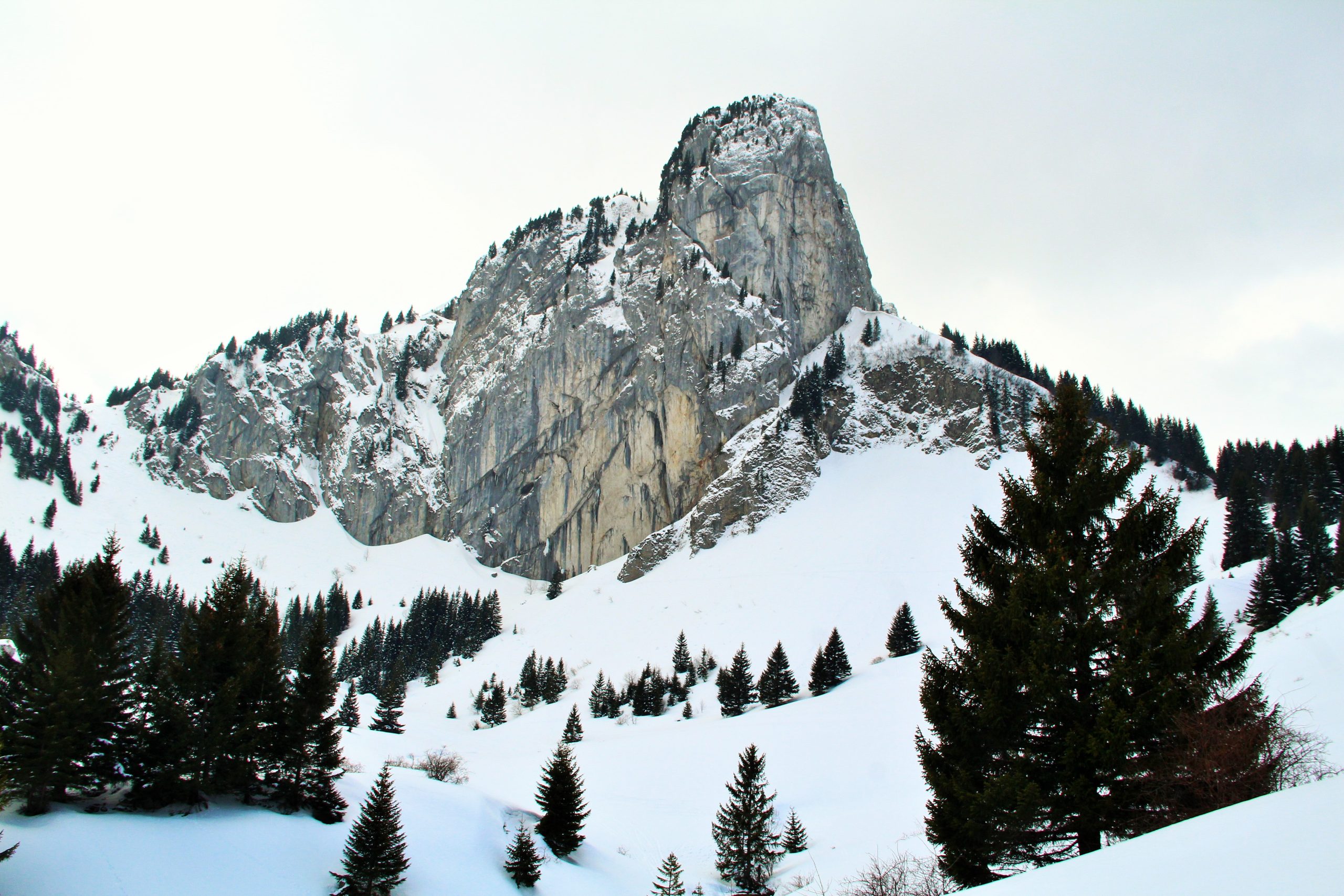 J’en prends vite plein la vue grâce à la proximité de la Roche Parnal qui nous domine, je coupe un peu l’itinéraire qui monte en direction de Sous le Cou, qui à mon gout passe bien trop proche des paroies rocheuses, complétement enneigées, dont une petite plaque menace un peu. On profite de la vue du Col pour faire la pause casse-croute.