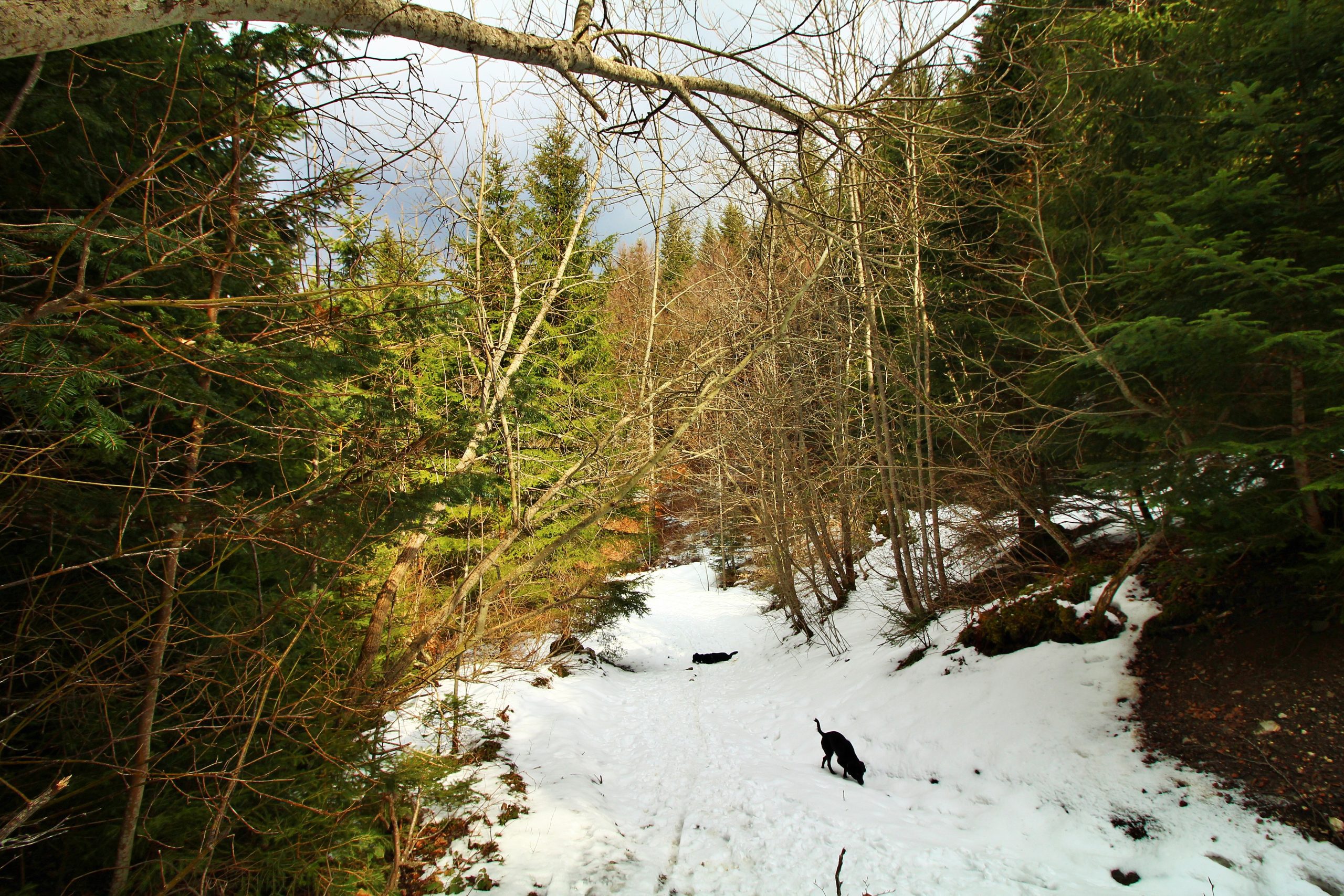 Le retour se fait principalement en forêt, j’attache Iron car il y a quelques chamois. Au vu de l’enneigement (complètement absent) je fais le choix de couper par le passage de la Cache, passage à bannir en cas de neige.